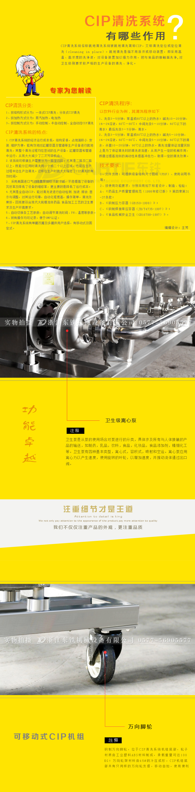 CIP清洗系統(tǒng)能保證一定的清洗效果,提高產(chǎn)品的安全性;節(jié)約操作時(shí)間,提高效率;節(jié)約勞動(dòng)力,保障操作安全;節(jié)約水、蒸汽等能源,減少洗滌劑用量;生產(chǎn)設(shè)備可實(shí)現(xiàn)大型化,自動(dòng)化水平高;延長(zhǎng)生產(chǎn)設(shè)備的使用壽命。CIP清洗的作用機(jī)理化學(xué)能主要是加入其中的化學(xué)試劑產(chǎn)生的,它是決定洗滌效果主要的因素。