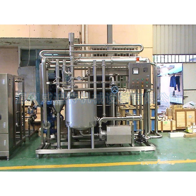 滅菌機由平衡罐輸入到換熱器內(nèi),在加熱部分與殺過菌的熱物料進行換熱后使冷物料溫度升到預(yù)定值,然后通過由蒸汽加熱的水間接加熱到120℃,物料在持溫管中維持所要求的溫度一段時間進行超高溫殺菌,從持溫管出來后與進入機內(nèi)的冷物料進行熱交換,后在冷卻段冷卻到預(yù)定的出口溫度,整個過程均在封閉狀態(tài)下進行,達到保證物料的生物穩(wěn)定性的目的。